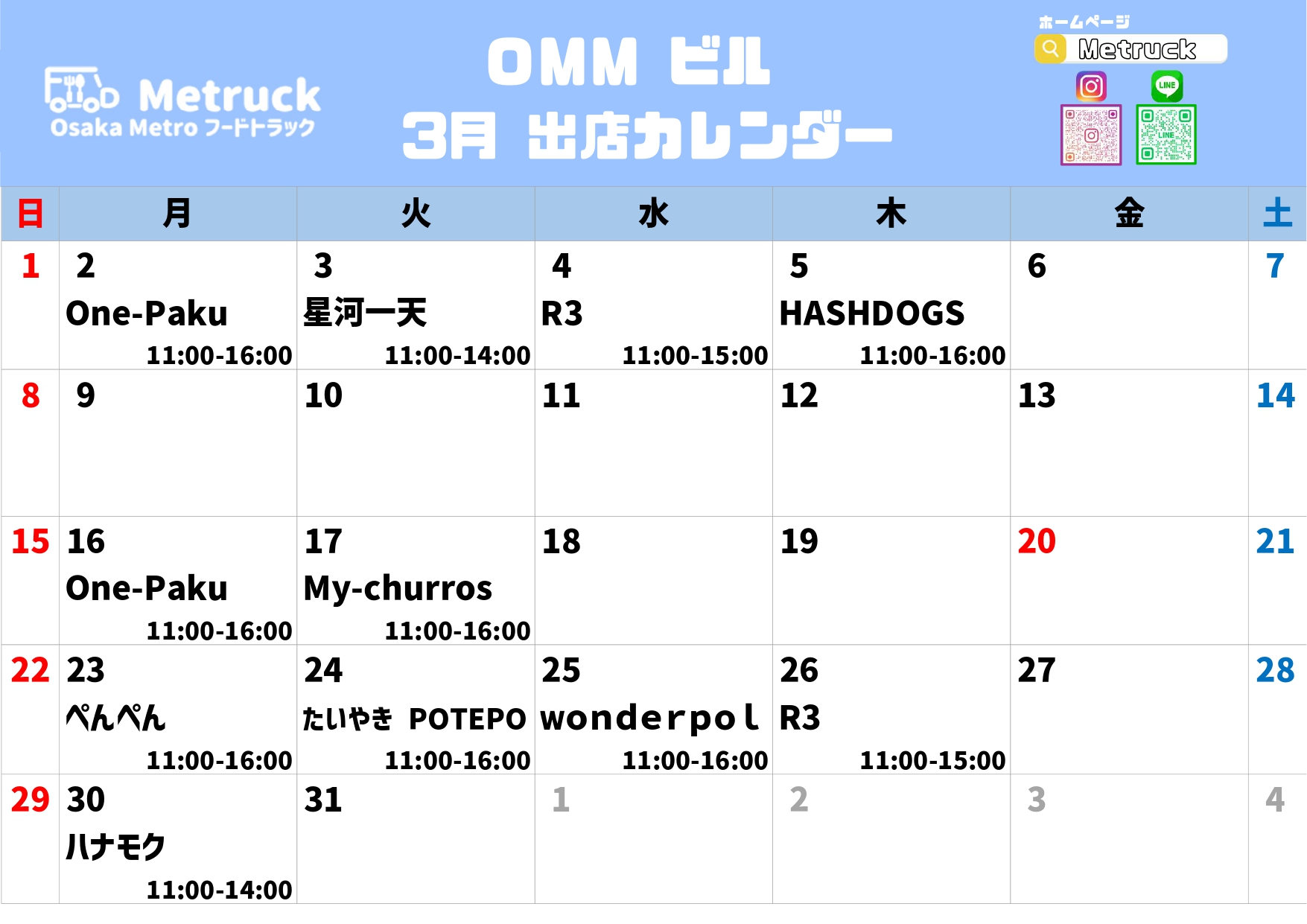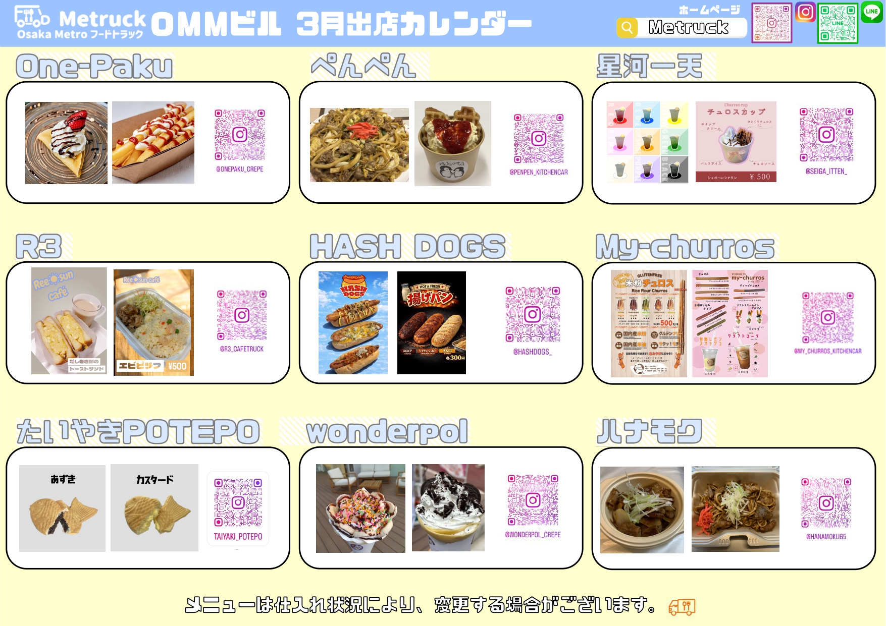 3月より、OMM1階駐車場西荷捌場において、キッチンカーが出店されます。 ランチのご調達、ブレイクタイムのおやつにぜひご利用ください。